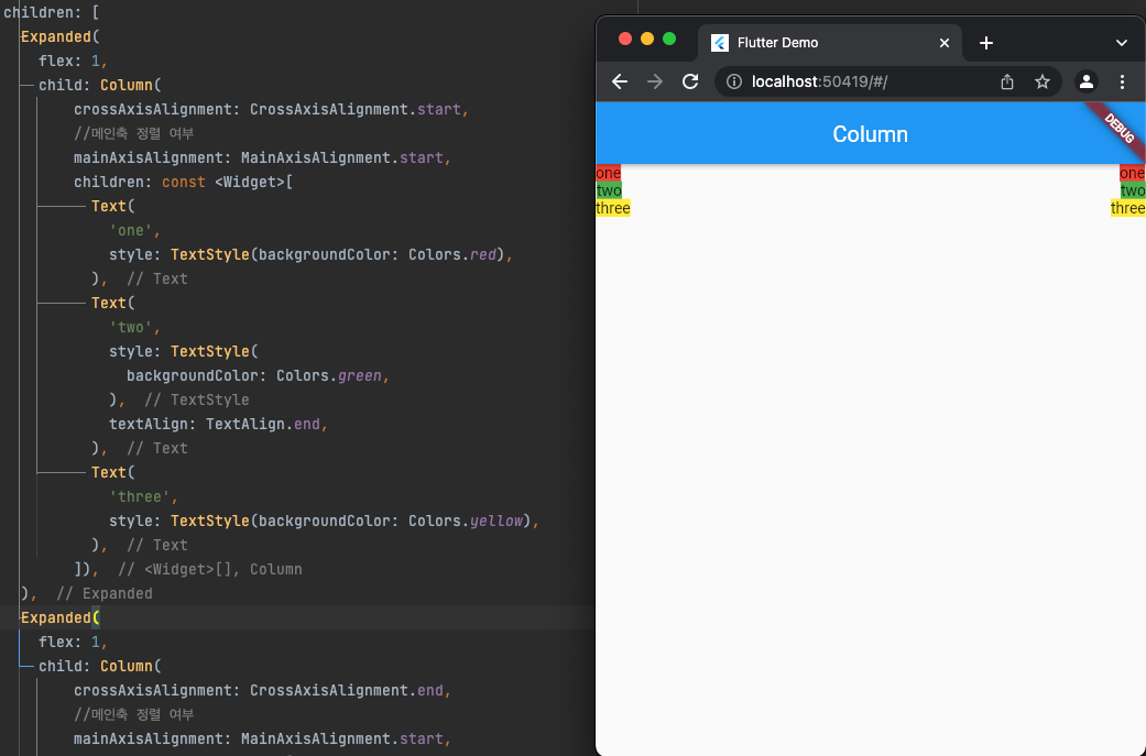 각 Column을 Expended로 감싼 다음에 flex 값으로 각각 1씩주어서 비율로 Column두개가 화면의 반반씩의 영역을 차지하게 되면