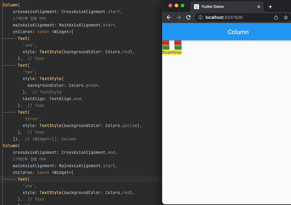 아래의 이미지와 같이 crossAxisAlignment 가 start, end로 설정되어 있지만 화면에는 변화내용이 없다.