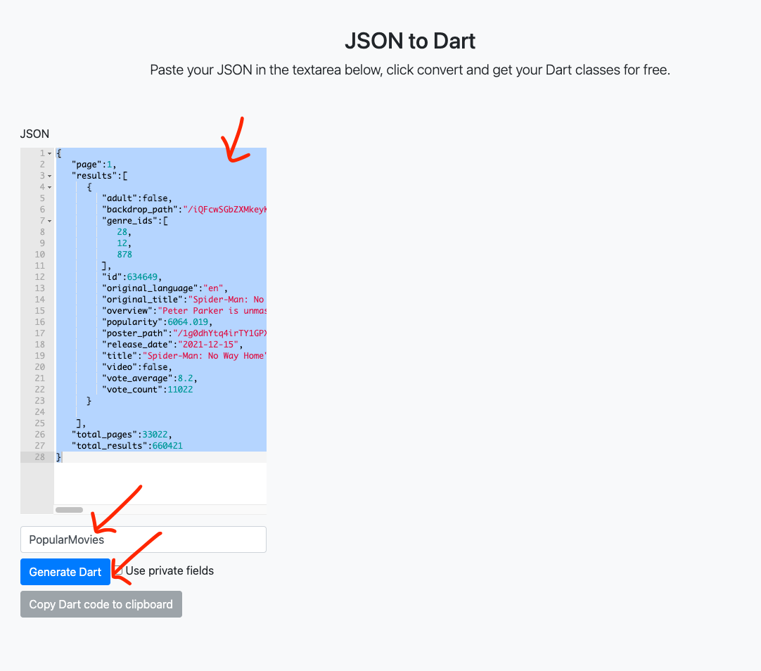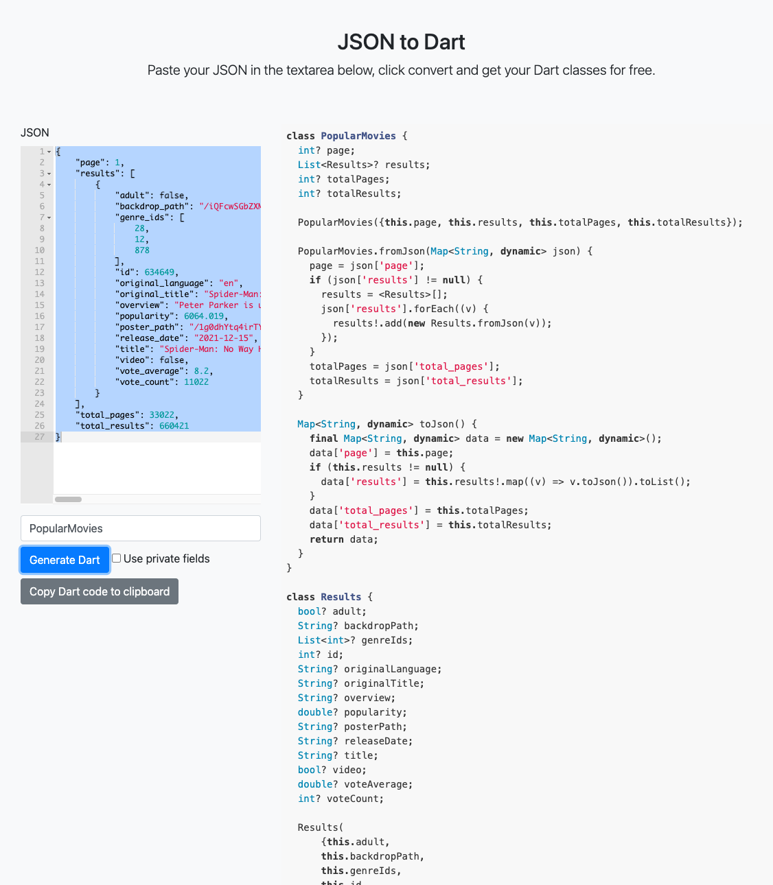 JSON to Dart Paste your JSON in the textarea below, click convert and get your Dart classes for free. Handcrafted by Javier Lecuona Github json_to_dart Code Twitter